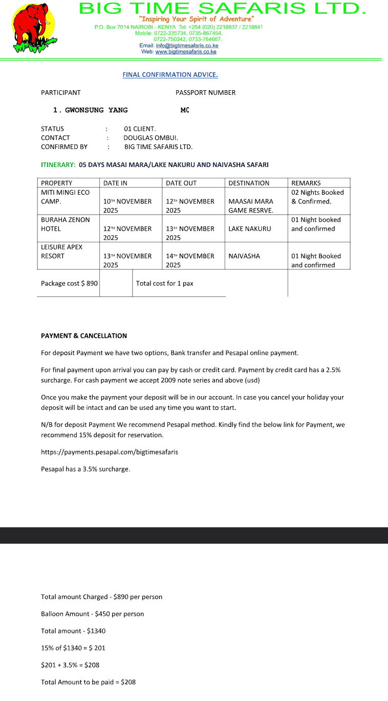 계약금(Deposit)은 15%를 먼저 업체에서 보내준 Pesapal 링크를 통해 결제를 하고 나머지 잔금은 케냐에 가서 사파리 투어 사무실에서 결제하는 방식이었다.