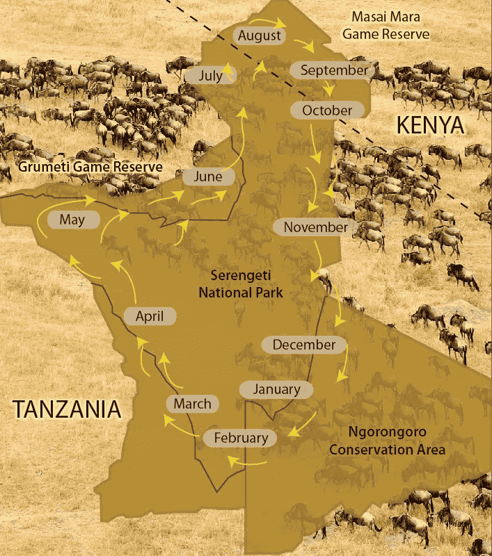 야생동물들의 서식지는 탄자니아의 세렝게티 국립공원, 케냐의 마사이 마라 국립공원에 걸쳐있다.