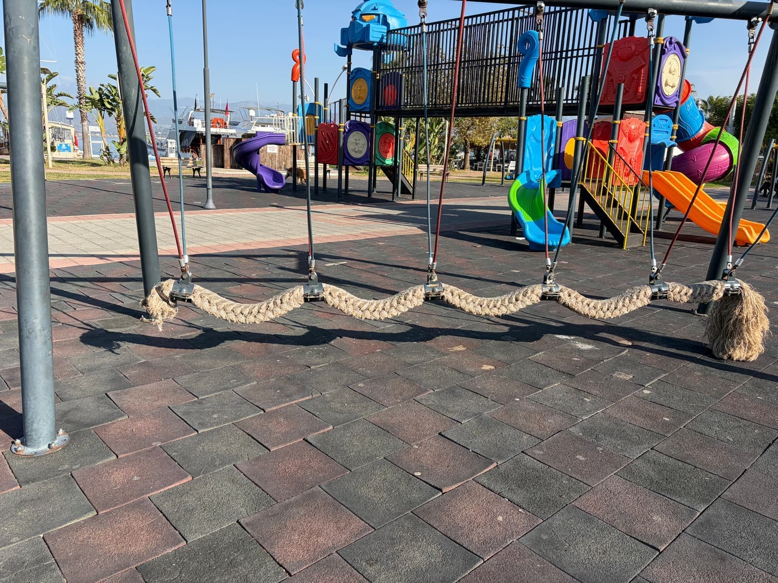 그리고 놀이터가 보여서 와봤는데 이렇게 길게 늘어져있는 게 처음에는 ‘단체로 타는 그네인가?’ 싶었는데 아마 저 줄을 밟고 건너는 것 같다.