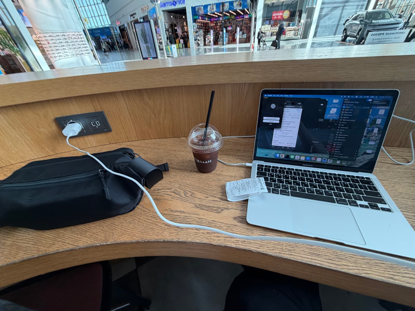 탑승까지 남은 시간동안 휴대폰/노트북을 충전하면서 콘센트를 두개나 차지했다.