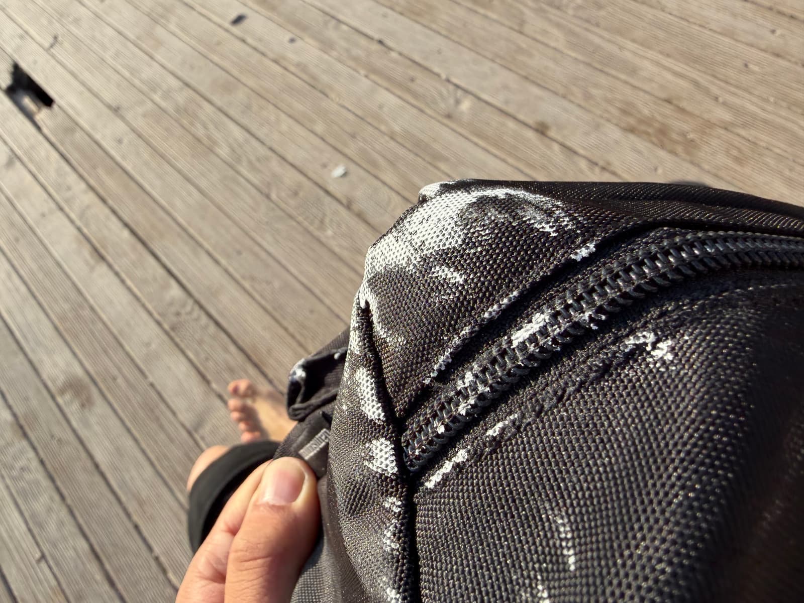 그리고 너무 발이 따갑다보니 네발로 걸어오고 그랬는데 그러다보니 손에 묻은 석회들로 인해 가방도 지저분해졌다.