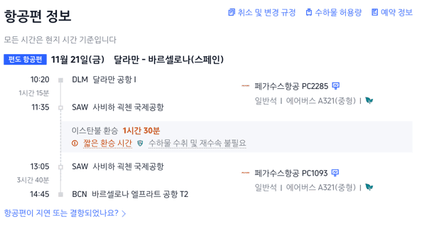 튀르키예 페티예에서 가장 가까운 공항인 달라만 공항에서 출발해서 이스탄불에 있는 사비하 괵첸 국제공항에서 경유해서 바르셀로나 공항으로 이동하는 경로이다.