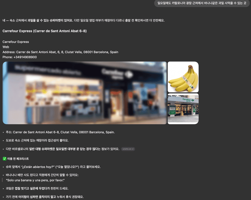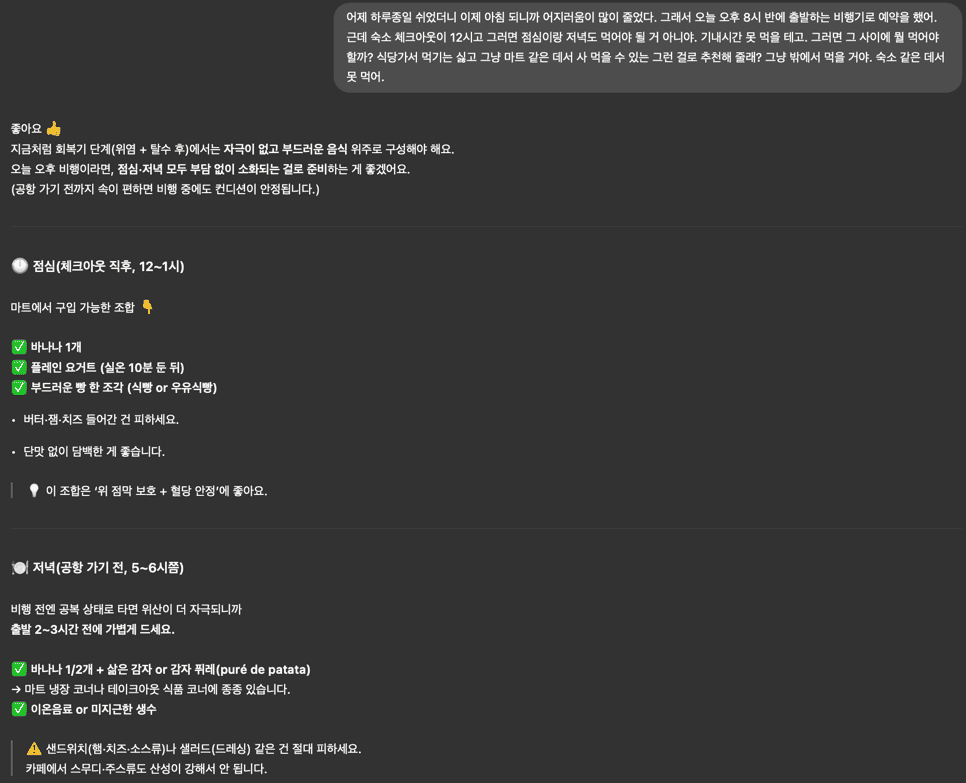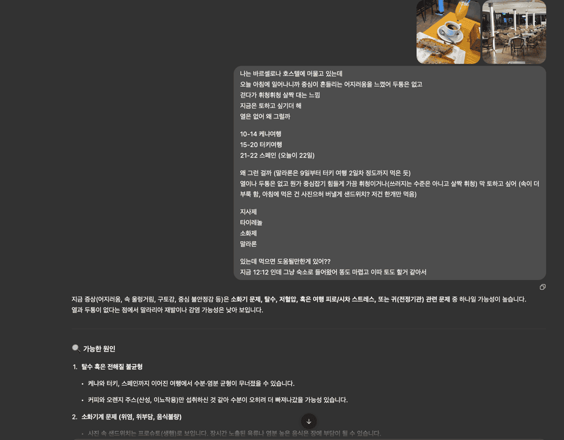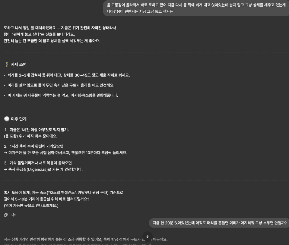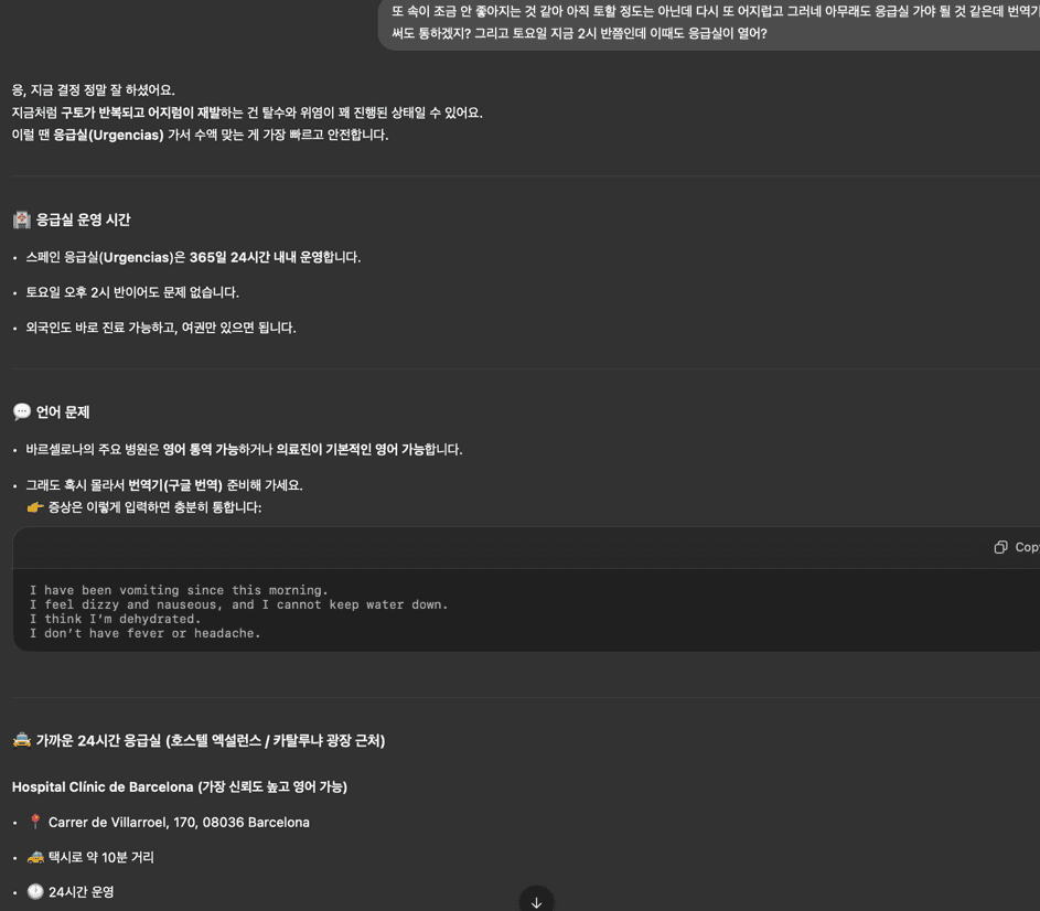 그리고 다른 곳에서도 챗GPT의 도움을 많이 받았지만 스페인에서는 응급실부터 그 이후 휴식/식사까지 정말 많은 도움을 받았다.